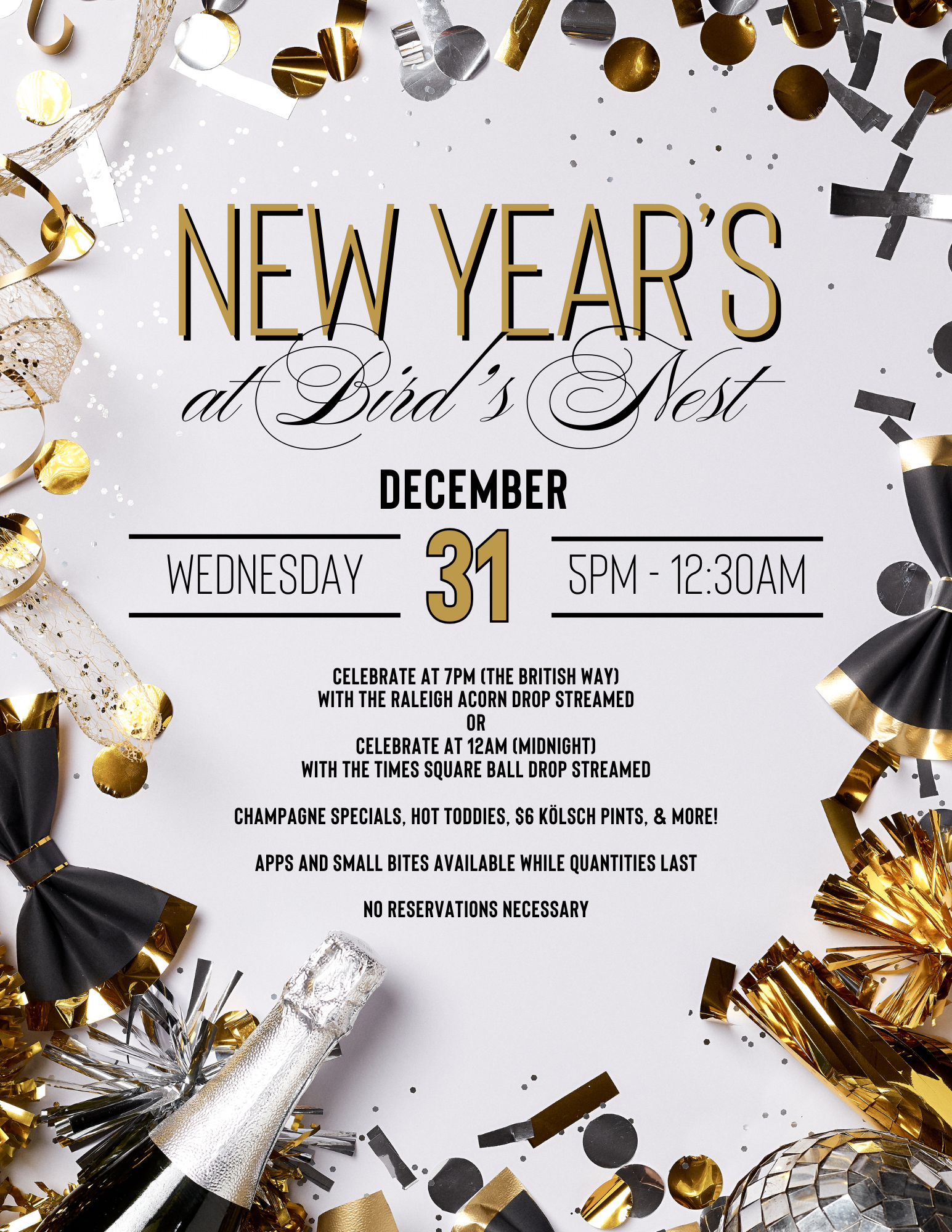 Celebrate at 7pm (The British Way) with the Raleigh Acorn drop streamed or at 12am (Midnight) with the Times Square Ball drop. Two times to ring in the New Year! Champagne specials, hot toddies, $6 Kolsch pints, and so much more! Apps and small bites available while quantities last. No reservations necessary this night. Stop […]